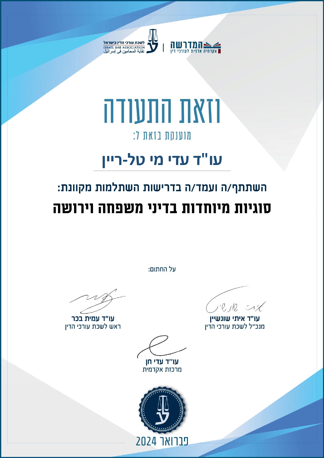 משרד בוטיק מוביל בתחום הנדל"ן והמקרקעין, צוואות ירושות ועיזבונות, ייפוי כוח מתמשך, חברות ותאגידים, דיני עבודה, גישור ומשפט אזרחי-מסחרי על כל היבטיו. ניסיון רב שנים ומומחיות בייצוג (ליטיגציה) בפני ערכאות המשפט השונות.