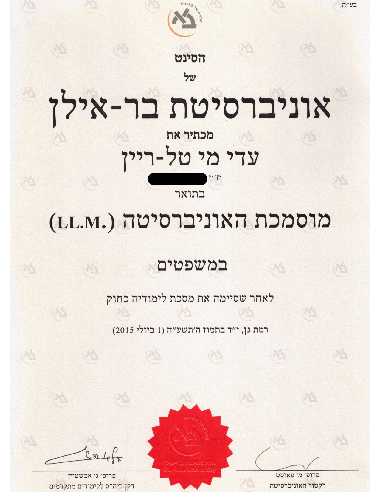 בוגרת תואר ראשון ושני במשפטים בהצטיינות (LL.B ו-LL.M ), אוניברסיטת בר-אילן, (2012, 2015).